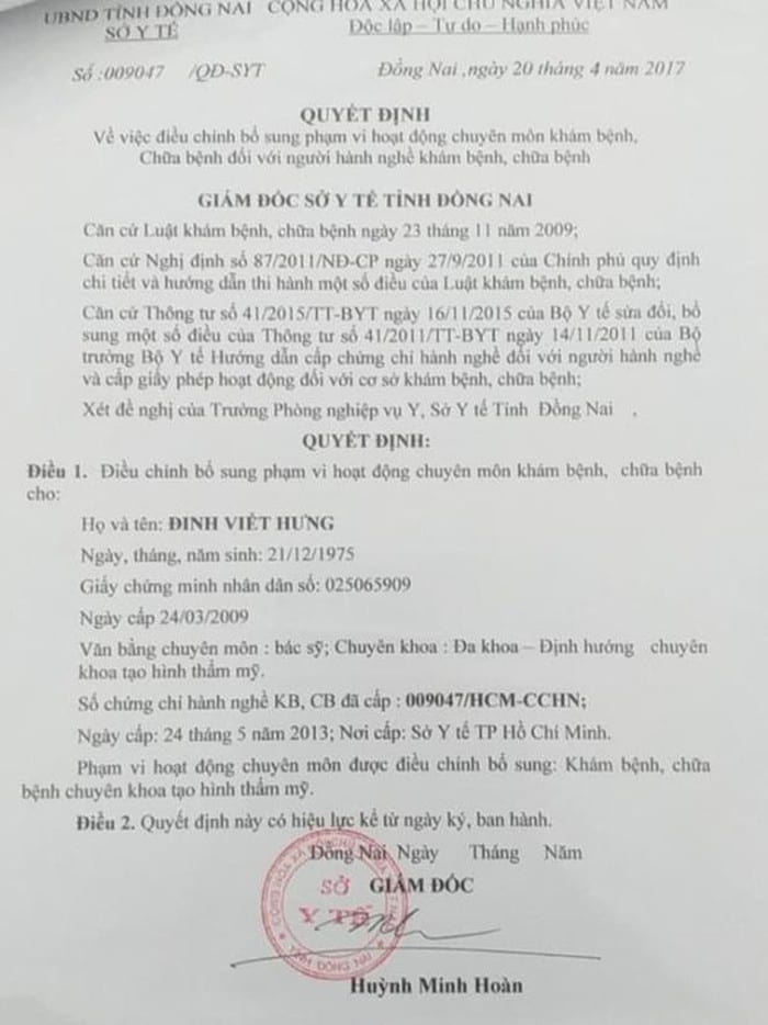 Trong văn bản xác minh của Thanh Tra Sở Y Tế tỉnh Đồng Nai nêu: “Không cấp bất kỳ quyết định bổ sung nào cho ông Đinh Viết Hưng. Quyết định có dấu hiệu giả mạo. Cụ thể, qua kiểm tra, rà soát hồ sơ của các cá nhân xin cấp chứng chỉ hành nghề, xin cấp bổ sung phạm vi hành nghề không có hồ sơ tên Đinh Viết Hưng.”