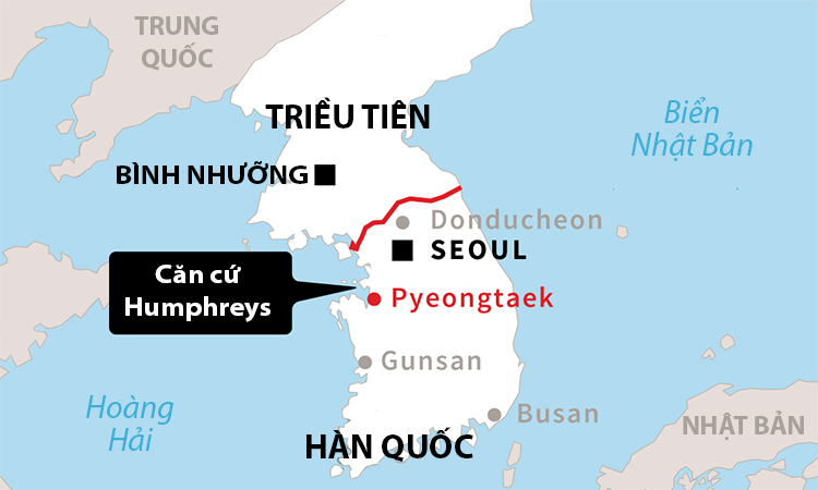 Vị trí căn cứ Humphreys của Mỹ tại Hàn Quốc. Đồ họa: Asia Times.