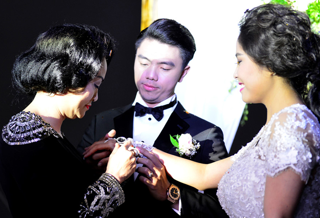 Trong ngày cưới con, muốn nhắc nhở con dâu ư nghĩa của thời gian, mẹ của chú rể Văn Quỳnh tặng Kiều Anh một chiếc đồng hồ đắt tiền thay v́ các món quà truyền thống khác.