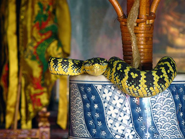 Thiếu môi trường sống tự nhiên cũng là lý do khiến số lượng của chúng bị xáo trộn. Nhưng vào mùa lễ hội, du khách vẫn bắt gặp cảnh rắn bò quanh đền. Chúng cuộn tròn mình trên ban thờ, quanh xà nhà, trên các bức tranh treo tường, tạo nên khoảnh khắc rợn người chẳng đâu có được.