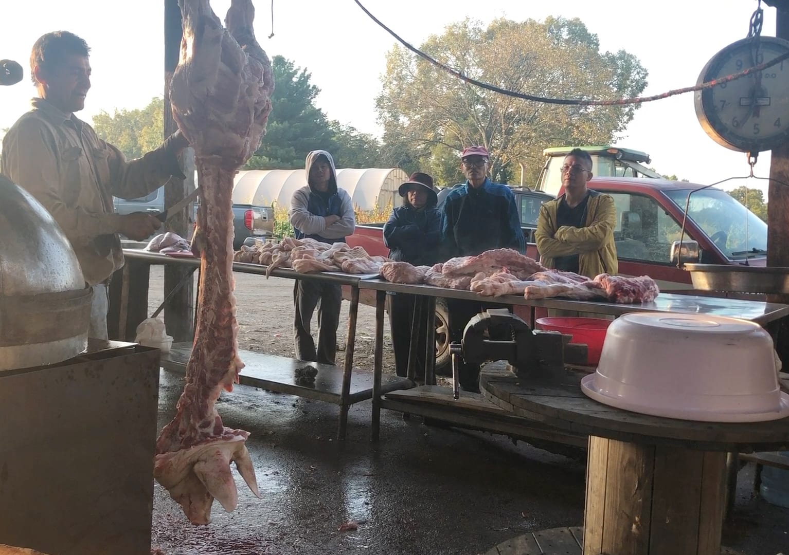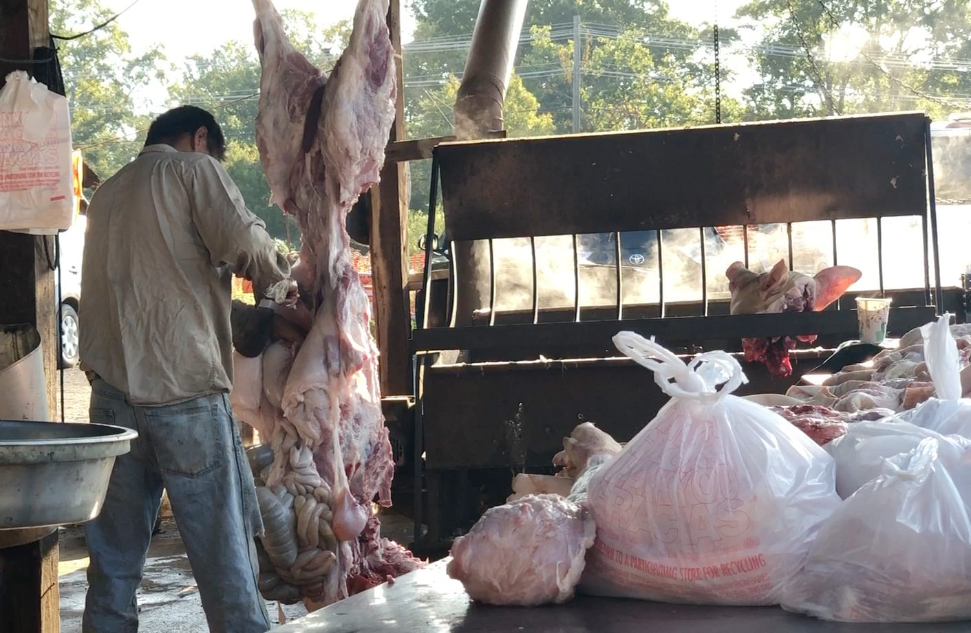 Bên trong sạp, con heo đầu tiên trong ngày được treo lên sau khi những người ở Cerritos Farm đã thực hiện làm sạch và luộc qua một lần. “Đồ tể” là người Hispanic, trong bộ quần áo “chẳng có gì phải sợ dơ nữa,” mang đôi ủng cao, hỏi từng người đang xếp hàng chờ để biết phần thịt nào họ cần.