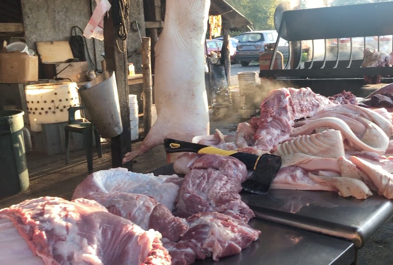 Khói bốc ra nghi ngút bên trong con heo đang bị treo ngược đầu sau nhát dao đầu tiên của người “đồ tể.”