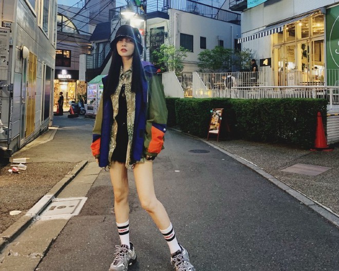 Với cách tạo dáng quay người như này giúp tôn lên thân hình nhỏ gọn song không kém phần quyến rũ của nữ diễn viên. Cô diện áo phông trắng kết hợp cùng quần shorts jeans, đi tất cao cổ mang đến hình ảnh trẻ trung, đầy năng động.