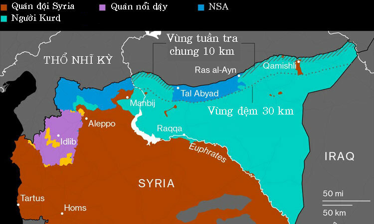 Kết quả chiến dịch “Mùa xuân Hòa bình” để tạo ra một “vùng đệm an ninh” dài 480km, rộng khoảng 30km không có người Kurd. Trong đó đoạn giữa (dài 120 km rộng 32 km) là do SNA pro Thổ Nhĩ Kỳ kiểm soát thực sự, phần còn lại là do SAA và cảnh sát quân sự Nga kiểm soát. Phần còn lại tuy Quân đội Thổ Nhĩ Kỳ và Nga tuần tra nhưng chỉ sâu 10 km.