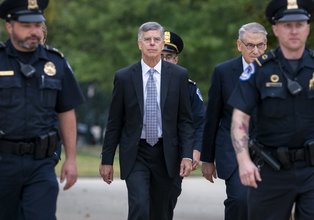 Ông William Taylor được cảnh sát hộ tống khi tới Điện Capital để ra làm chứng trước các ủy ban Hạ viện đang điều tra luận tội Tổng thống Trump ngày 22/10. Ảnh: AP.