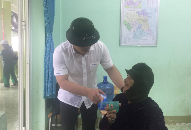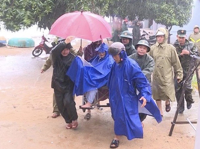 Bộ đội vùng tâm bão Phổ Thạnh, huyện Đức Phổ đưa người già vùng nguy hiểm đi đến nơi trú ẩn an toàn.