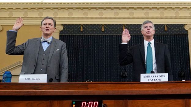Xuất hiện tại buổi điều trần hôm thứ Tư, Đại sứ Taylor nói về việc Đại sứ Sondland nói với ông rằng tổng thống, vốn là một doanh nhân, muốn nhận được những gì "nợ ông" trước khi "ký séc" và sẽ có "bế tắc" nếu Ukraine không hành động - điều mà Taylor giải thích có nghĩa là viện trợ quân sự sẽ không tiếp tục nếu Ukraine không tiến hành cuộc điều tra.