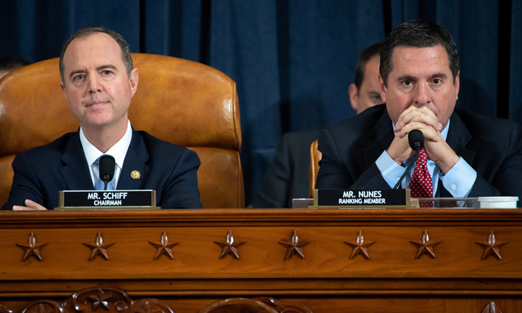 Chủ tịch Ủy ban Tình báo Hạ viện Mỹ Adam Schiff (trái) và nghị sĩ Cộng hòa Devin Nunes trong phiên điều trần tại Tòa nhà Quốc hội Mỹ ở Washington hôm 13/11. Ảnh: Reuters.