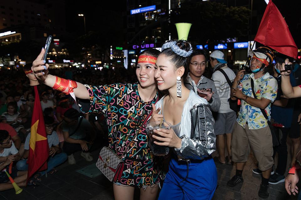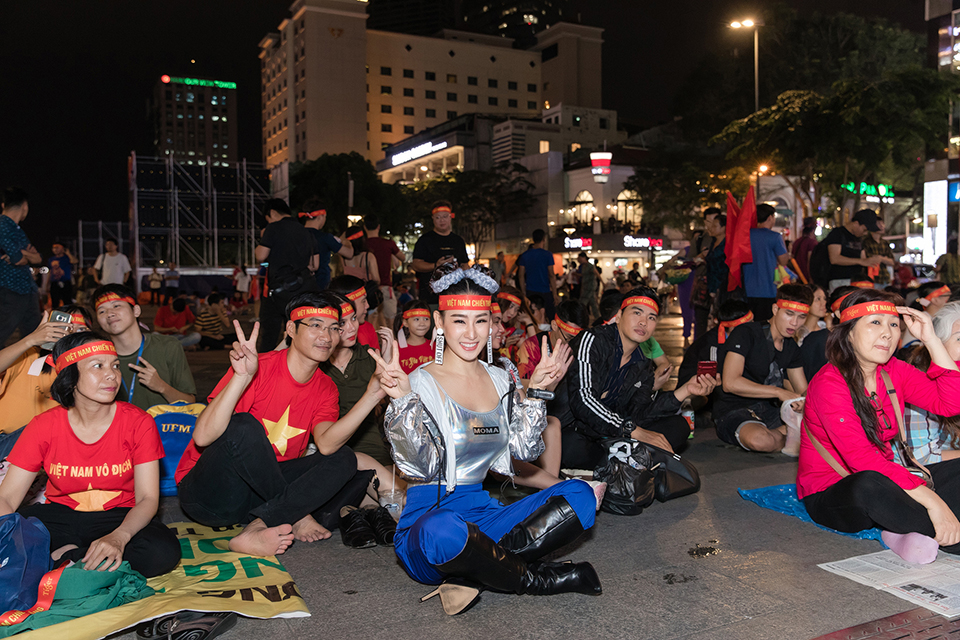 Sau phần trình diễn DJ hơn 30 phút, Oxy đeo băng rôn, cầm cờ đỏ sao vàng, cùng hàng nghìn khán giả tại phố đi bộ Nguyễn Huệ cổ vũ đội tuyển Việt Nam.