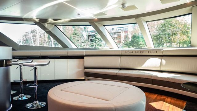 Bên trong Royal Falcon One có 4 cabin dành cho hành khách rộng rãi và 1 phòng lớn tích hợp sàn riêng, bể sục, quầy bar, phòng quan sát… Nội thất hiện đại của siêu du thuyền gồm màu trắng và xanh, kết hợp với bề mặt kim loại và gỗ.