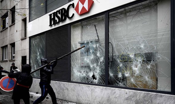 Người biểu t́nh tấn công một trụ sở của ngân hàng HSBC tại Paris (Ảnh: Getty)