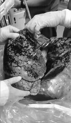 Hai lá phổi của bệnh nhân được lấy ra trong tình trạng đã chuyển màu đen, căng phồng, to bất thường, có tình trạng bị vôi hóa và khí thũng.