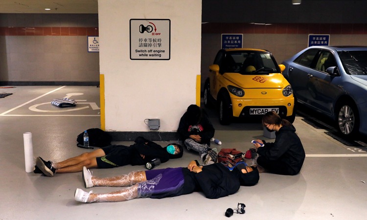 Người biểu tình ngủ dưới tầng hầm đỗ xe của Đại học Bách khoa Hong Kong hôm 20/11. Ảnh: Reuters.