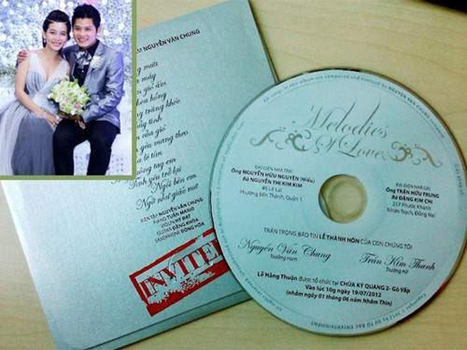 Ở đám cưới năm 2012, nhạc sĩ Nguyễn Văn Chung gửi đến khách mời tấm thiệp cưới là chiếc đĩa CD thu sẵn ca khúc do anh sáng tác. Trên mặt đĩa là những thông tin cơ bản về đám cưới nhạc sĩ bao gồm thời gian, địa điểm, thông tin nhà trai, nhà gái.