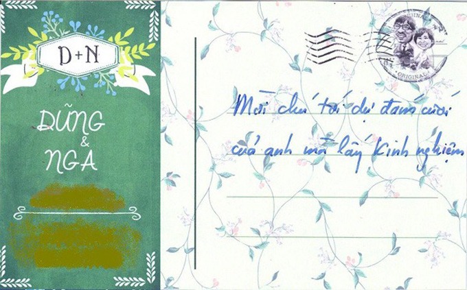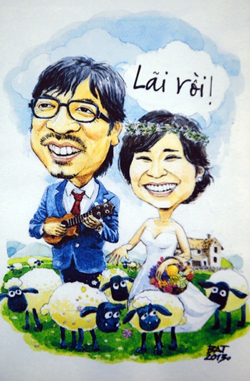 Chiếc thiệp cưới gây ấn tượng v́ h́nh ảnh cô dâu, chú rể được vẽ bằng nét tranh biếm họa. Cô dâu chú rể cầm đàn, xách lẵng hoa đàn hát trên cánh đồng bên cạnh những chú cừu và câu 'Lăi rồi' đă thể hiện khá rơ nét tính cách hài hước của chủ nhân. Một số bạn bè của cô dâu chú rể tiết lộ phần lời mời được Giáo sư Xoay chăm chút viết riêng cho từng người, không ai giống ai.