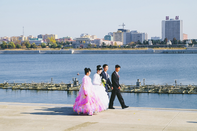 Hai cặp cô dâu, chú rể ven bờ sông Đại Đồng. Anh Phong cho rằng sự yên bình trong thành phố thể hiện rõ hơn bởi các đôi chụp ảnh cưới tại điểm tham quan nổi tiếng như: Quảng trường Kim Nhật Thành, Đài phun nước Mansudae, Khải Hoàn Môn... Theo lời cô Kim, hướng dẫn viên địa phương, các cặp đôi trước khi làm lễ cưới sẽ đến đài tưởng niệm Mansudae (nơi đặt hai bức tượng đồng của lãnh tụ Kim Il-sung và Kim Jong-il) để bày tỏ lòng tôn kính trước khi về chung một nhà.