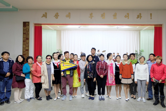 Du khách Vietravel chụp ảnh cùng các em thiếu nhi Triều Tiên. Anh Phong khẳng định: "Người dân Triều Tiên hiền hòa và mến khách". Dù quốc gia này mới bắt đầu mở cửa du lịch, khách nước ngoài luôn được người dân chào đón nồng hậu, nhiệt tình và thân thiện. Ngày đầu tiên đến Bình Nhưỡng, đoàn khách được chào đón bằng một tiết mục ca - múa nhạc do các em thiếu nhi tại một trường trung học ven thành phố biểu diễn với nhạc cụ là đàn organ, trống, guitar...