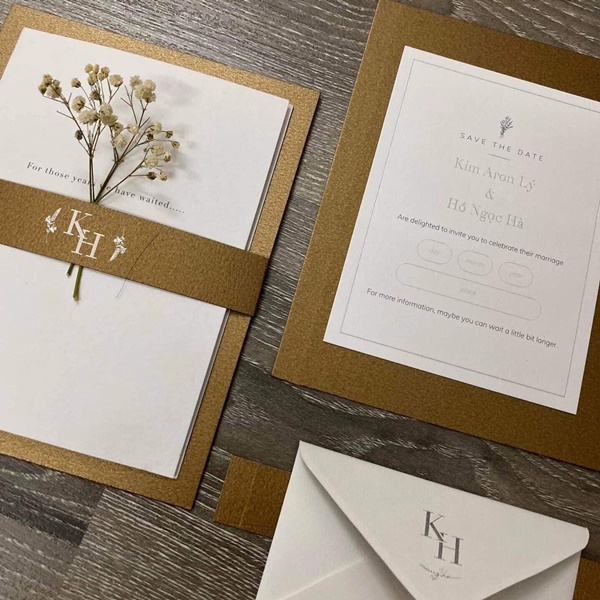 Dòng chữ Save the Date cũng là thông báo quen thuộc của cô dâu và chú rể với khách mời dành thời gian cho sự kiện trọng đại. Tuy nhiên, ngày cưới trong thiệp lại bị bỏ ngỏ.