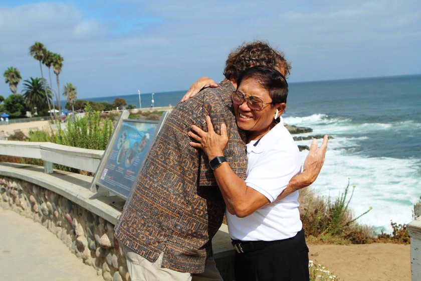 Ông Jeff Koch và ông Phạm Sang gặp nhau lần đầu kể từ khi ông Koch cứu mạng ông Sang 43 năm trước, tại hang đá nằm bên dưới chân của họ ở La Jolla Cove. (Corey Levitan / La Jolla Light)