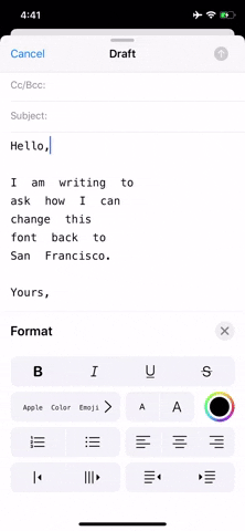 Kể từ iOS 9, Apple bắt đầu sử dụng phông chữ San Francisco của chính mình làm phông chữ mặc định trên iOS, thay cho phông chữ Helvetica. Tuy nhiên, có một điều rất lạ là phông chữ San Francisco này không xuất hiện dưới dạng một lựa chọn trong danh sách phông chữ trên các ứng dụng hỗ trợ phông tùy chỉnh, điển hình là ứng dụng Mail. Trên ứng dụng Mail, sau khi bạn chọn phông tùy chỉnh, bạn sẽ không tìm thấy tùy chọn quay về phông San Francisco mặc định.