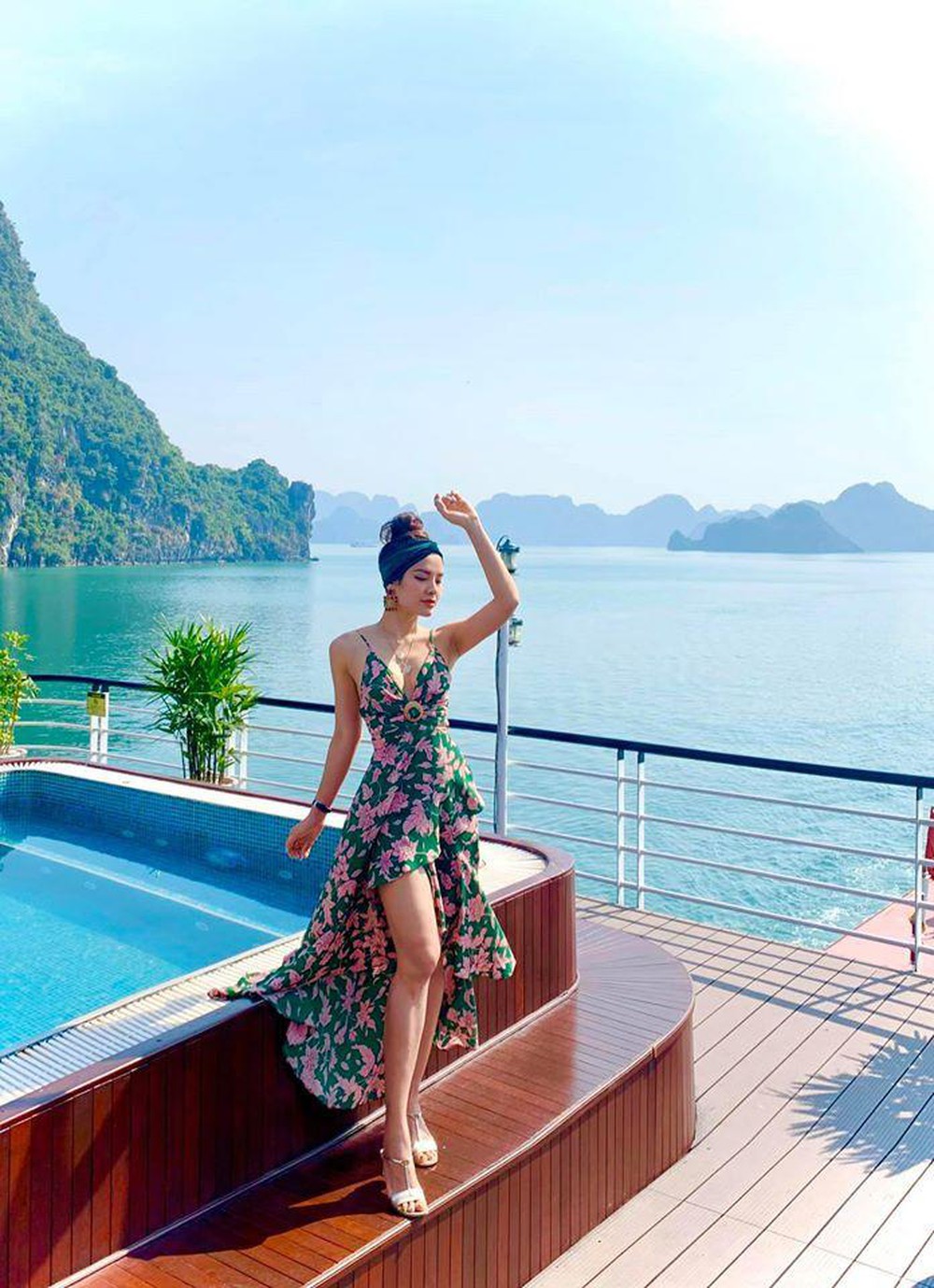 Người đẹp gốc An Giang thường xuyên ăn mặc gợi cảm trong các chuyến du lịch.