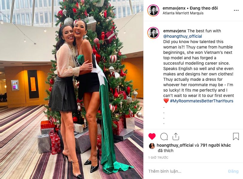 Bên dưới những bài viết này, Emma Jenkins còn kèm theo hashtag rất dễ thương chính là “#my roommates better than yours” - “bạn cùng phòng của tôi tốt hơn của bạn”, chứng minh rằng dù cuộc thi chỉ mới diễn ra hơn 2 ngày nhưng 2 cô gái đã rất thân thiết. Nhiều fan còn bình luận vui rằng biết đâu năm tay 2 đại diện Việt Nam và Anh Quốc cùng nắm tay bước vào Top 2.