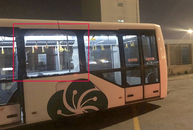 Xe buýt chở khách trong sân bay Tân Sơn Nhất bị vỡ cửa kính sau khi thùng hàng va phải.