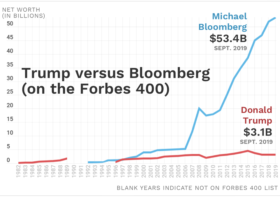 Ông Bloomberg lần đầu tiên lọt vào danh sách 400 người giàu nhất nước Mỹ do Forbes công bố (những người có tài sản trên 350 triệu USD) vào năm 1992 sau khi các thiết bị đầu cuối của Bloomberg L.P với các dữ liệu về chứng khoán thế giới, trái phiếu... bắt đầu phổ biến ở Phố Wall. Cùng lúc đó, Donald Trump đang chiến đấu để cứu “đế chế” của mình thoát khỏi cảnh nợ nần.