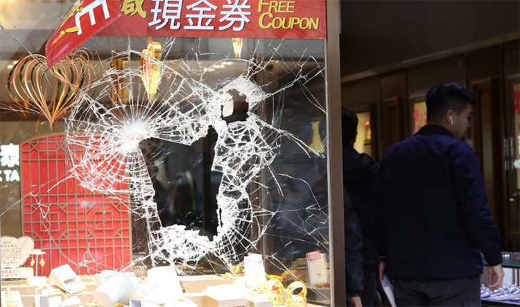 Cửa trước của tiệm trang sức Fook Tai bị nhóm cướp đập vỡ hôm 2/12. Ảnh: SCMP