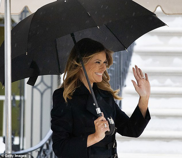 Dù trời mưa gió, bà Melania vẫn tươi cười rạng rỡ trước ống kính. Ảnh: Getty