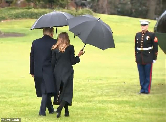 Hai vợ chồng ông Trump lựa chọn trang phục cùng tông và thể hiện tình cảm bằng động tác khoác tay thân mật. Ảnh: Live Leak