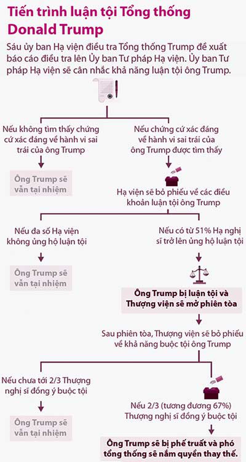 Ngày 3-12, Ủy ban Tình báo Hạ viện chuyển báo cáo điều tra sang Ủy ban Tư pháp Hạ viện. Dự kiến ngày 4-12, Ủy ban Tư pháp Hạ viện sẽ bắt đầu tiến trình luận tội, xác định tội danh của ông Trump. Tiến trình này có thể diễn ra trong hai tuần. Sau đó, Hạ viện sẽ bỏ phiếu về các điều khoản luận tội mà Ủy ban Tư pháp đề xuất và nếu được đa số thông qua, vụ việc sẽ được chuyển sang Thượng viện xét xử. Nếu đa số Thượng viện đồng ý buộc tội, ông Trump sẽ là tổng thống Mỹ đầu tiên trong lịch sử bị phế truất thông qua bị luận tội.