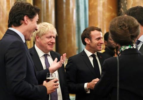 Hình ảnh được cho là các nhà lãnh đạo NATO (từ trái sang: Thủ tướng Canada J. Trudeau, Thủ tướng Anh B. Johnson và Tổng thống Pháp E. Macron) đang "nói xấu" ông Trump
