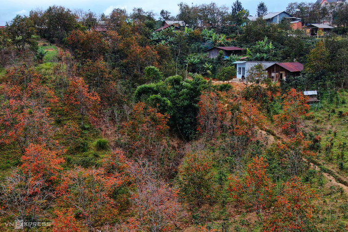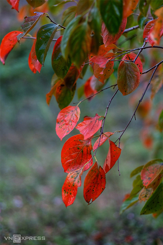 Những ngôi nhà của người dân tộc Cil, xã Đa Nhim, huyện Lạc Dương nằm nép mình bên vườn hồng rực lá đỏ. Sau khoảng hai tuần lá sẽ rụng sạch, cây hồng chỉ còn trơ cành chờ khi đâm chồi nảy lộc vào mùa xuân.
