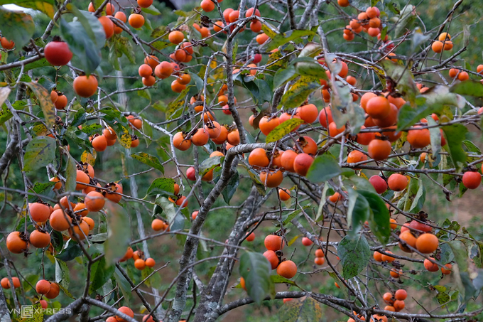 Một góc vườn hồng đầy trái chín những ngày cuối tháng 11. Đa phần người dân hái hồng rồi mang ra chợ bán thay vì kinh doanh tại nhà. Một phần quả thu hoạch được dùng làm hồng treo gió.