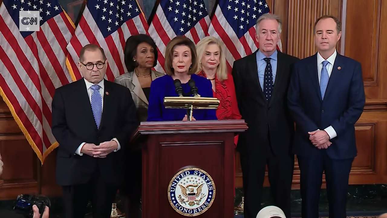 Các lãnh đạo Đảng Dân chủ tại Hạ viện thông báo về 2 điều khoản luận tội ông Trump hôm 10/12 (Ảnh: Youtube)