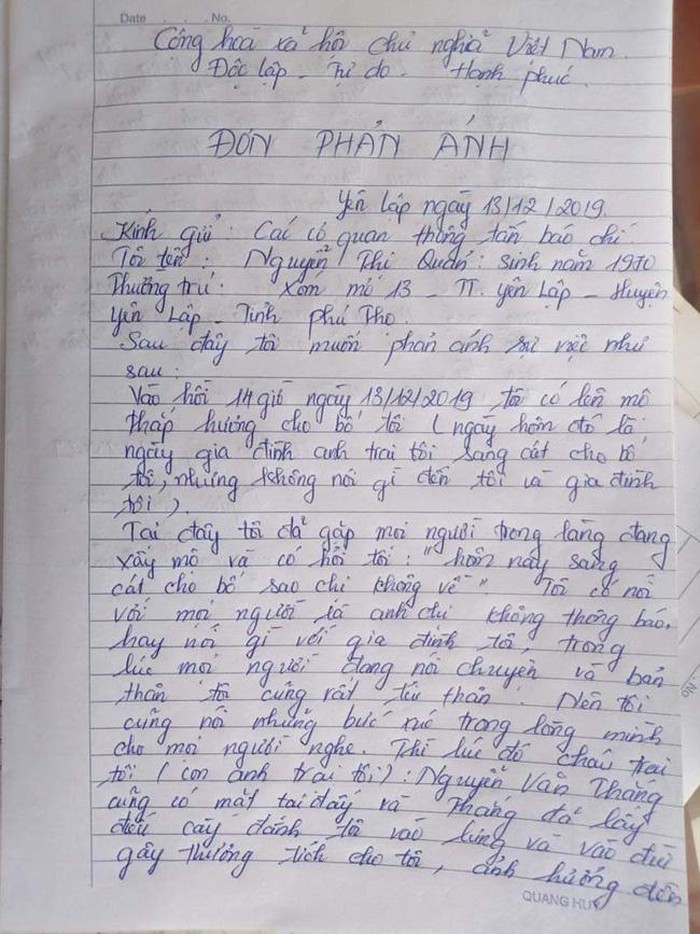 Theo như đơn tố cáo của bà Quản, vào hồi 14h ngày 13/12/2019 bà Quản có lên mộ thắp hương cho bố. Được biết, ngày hôm đó gia đình bà Quản có tổ chức sang cát cho người cha đã khuất. Tuy nhiên, do không được anh trai thông báo cho biết về sự việc này nên khi biết và đến thì bà Quản đã vô cùng bức xúc. Khi được hàng xóm xung quanh hỏi han thì bà Quản đã nói hết những bức xúc trong lòng cho mọi người cùng nghe.