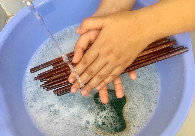 Bạn nên pha loãng nước rửa bát với nước sạch rồi dùng vải mềm rửa từng chiếc đũa một. Sau đó, rửa đũa dưới vòi nước chảy. Cách này có thể làm giảm ma sát, tránh dư lượng chất hóa học còn sót lại trên đũa.