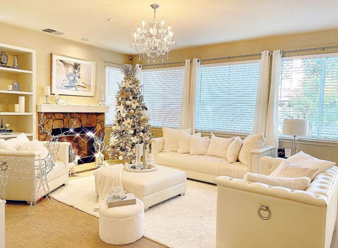 Tiếp đến là một không gian mà Phạm Hương rất thích và đã dành nhiều thời gian, tâm huyết cho nó đó là căn phòng có tên Family-room. Trong căn phòng này, cô sử dụng tông màu trắng làm chủ đạo. Từ ghế, đồ vật trang trí, cây thông Noel đều được sử dụng tông màu trắng khiến cho cô cảm giác như lạc vào một khu vườn đầy tuyết rất đẹp. Đặc biệt là khi ngồi bên lò sưởi nữa thì rất ấm áp và hạnh phúc.