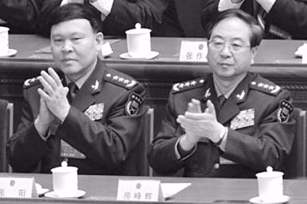 Thượng tướng Trương Dương (phải) và Phòng Phong Huy (trái) trong một phiên họp của ĐCSTQ. (Ảnh qua Dwnews)