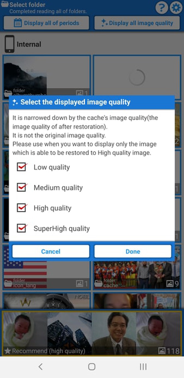 Tại đây, bạn chỉ nên đánh dấu vào tùy chọn “Medium quality”, “High quality” và “SuperHigh quality” để ứng dụng chỉ hiển thị những hình ảnh có khả năng khôi phục mà vẫn giữ được chất lượng cao và loại bớt các hình ảnh chất lượng thấp xuất hiện trên ứng dụng khiến cho việc tìm kiếm các hình ảnh trở nên khó khăn hơn.