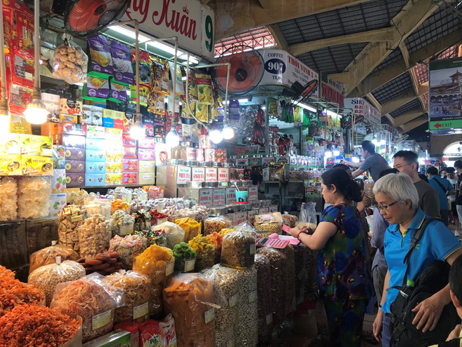 Trưa ngày cuối tuần, ngay sau cửa Bắc chợ Bến Thành (Q.1, TP.HCM), xe và người đi lại chật như nêm. “Trưa nào chả kẹt xe, suốt cả tháng nay rồi, không phải đến giờ này”, bà Hoa bán hoa ngay sau cửa Bắc chợ Bến Thành cho biết. Bên hông chợ, phía cửa Tây, các nơi giữ xe gắn máy đã kịp nâng giá giữ xe từ 10.000 đồng/chiếc tuần trước lên 15.000 đồng/chiếc. Thắc mắc, nhận được câu trả lời gọn lỏn: “Tết mà!”.