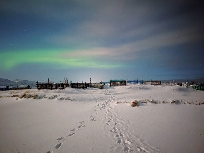 Cực quang uốn lượn phía trên một nghĩa địa ở làng ven biển Teriberka.