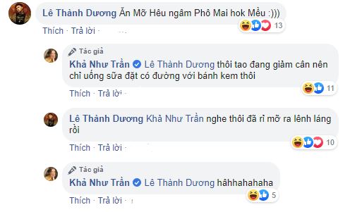 Mới đây, Ngô Kiến Huy đã lên tiếng khi biết được cô em thân thiết Ninh Dương Lan Ngọc và Khả Như nói xấu mình. Thay vì bực bội, giận dỗi như nhiều người nghĩ, Ngô Kiến Huy “thả nhẹ” một câu hỏi liên quan đến cân nặng trên trang cá nhân của Khả Như: “Ăn mỡ heo ngâm phô mai không Mèo?”. Trước lời “dụ dỗ” của đồng nghiệp, nữ diễn viên từ chối với lý do đang trong quá trình giảm cân: “Thôi, đang giảm cân nên chỉ uống sữa đặc có đường với bánh kem thôi”.