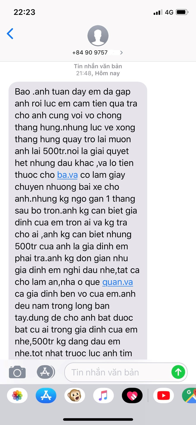 Đầu tháng 12.2019, do vay nhiều người, mất khả năng chi trả nên anh H. cùng vợ dắt 2 con nhỏ bỏ trốn. Vì không đòi được 500 triệu đã cho anh H. vay, ông T. bắt anh B. trả nợ thay. Điện thoại anh B. còn lưu lại các tin nhắn bị ông T. đe dọa: “500 triệu của anh là gia đình em (tức anh B.) phải trả, đừng để anh bắt được bất cứ ai trong gia đình của em, 500 triệu không đáng đâu em nhé”; “Anh sẽ tìm được H., con riêng của em và gia đình em trong một nốt nhạc”... Quá sợ hãi, vợ chồng anh B. cũng ẵm con nhỏ 9 tháng tuổi đi lánh nạn, tránh bị các chủ nợ của em trai truy đòi.