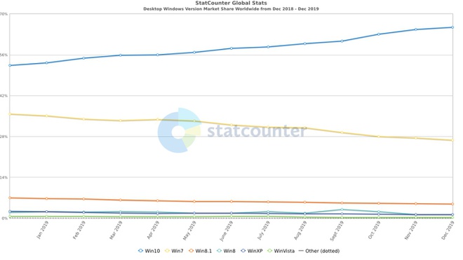 Theo số liệu từ StatCounter, kết thúc năm 2019 thị phần của Windows 7 vẫn còn 26,7%. Hệ điều hành thống trị hiện nay là Windows 10 với 65,4%. Windows 10 đã bỏ xa về thị phần, nhưng con số đó cho thấy Windows 7 vẫn được rất nhiều người dùng ưa chuộng.