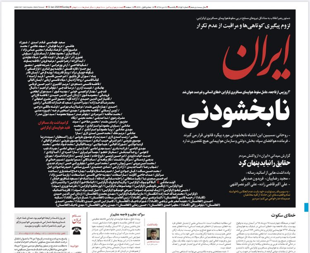 Nhật báo chính thức của Iran mang tên Iran đã công bố tên của các nạn nhân được xếp theo hình một đuôi máy bay để tưởng niệm họ.