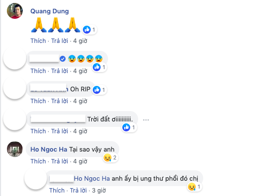 Trên trang cá nhân, nhiều nghệ sĩ như Nguyễn Hồng Thuận, Phương Thanh, Hồ Ngọc Hà, Quang Dũng... bày tỏ sự đau xót trước sự ra đi của Thành Nguyễn.