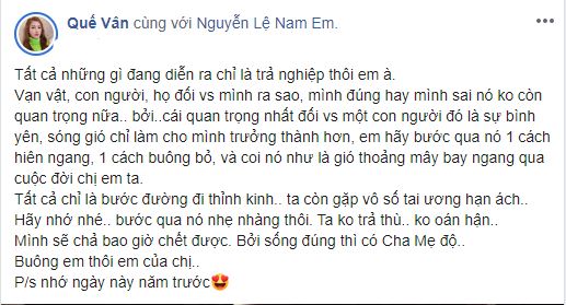 Quế Vân cho rằng, tất cả những ồn ào đang diễn ra chỉ là “trả nghiệp”, đúng sai không còn quan trọng bởi điều quan trọng nhất là sự bình yên. Theo Quế Vân, Nam Em sẽ trưởng thành hơn, dũng cảm buông bỏ sau khi trải qua nhiều việc không hay.
