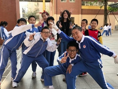 Marilyn (áo đen) chụp ảnh cùng học sinh ở trường. Ảnh: Her Quirky Journey.